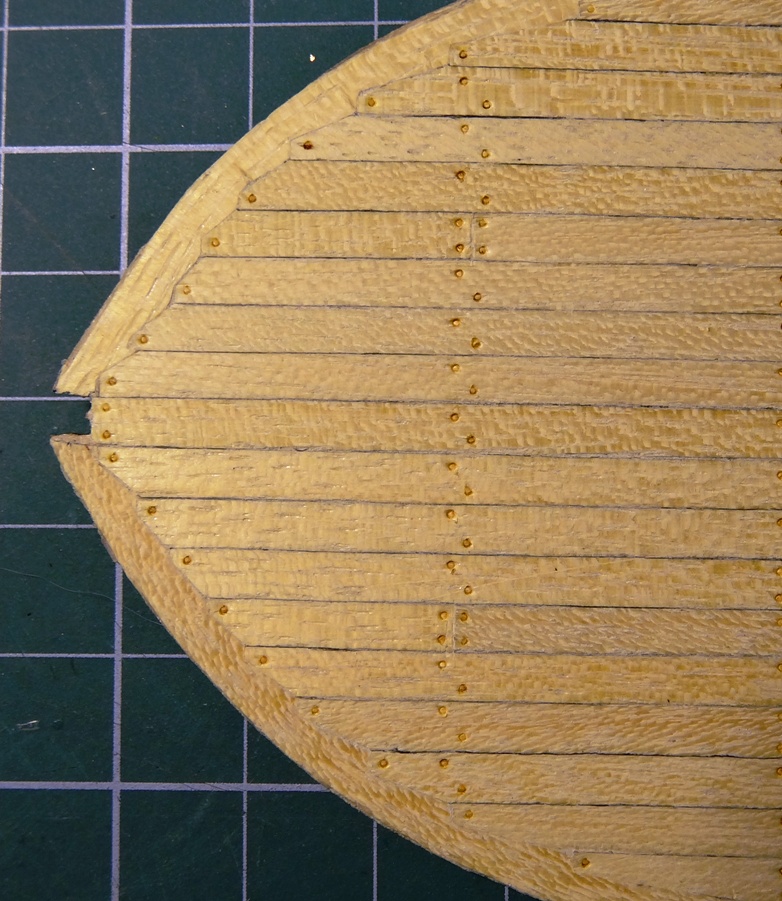Есть варианты наборов, где палуба уже дана с имитацией гвоздевания методом высокоточной лазерной гравировки. В этом случае окружность будет примерно 0,3мм для 72 масштаба.