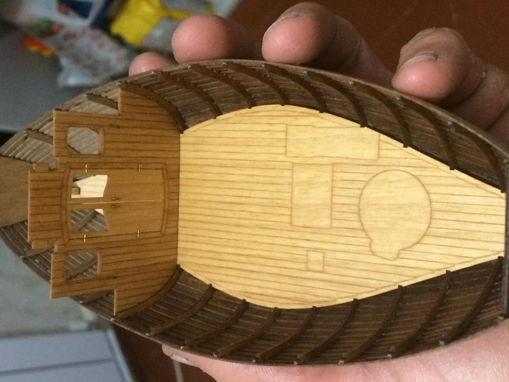 При склейке тонкого шпона между собой на ПВА деталь начинает гнуться в разные стороны, и её довольно сложно склеить ровно. Нужно соблюдать технологию: один из вариантов - сначала нанести клей на обе поверхности, дать ему подсохнуть и затем склеить при помощи нагрева. Я, конечно, так не сделал, и пришлось помучиться с приклеиванием и подгонкой каюты и палубы.